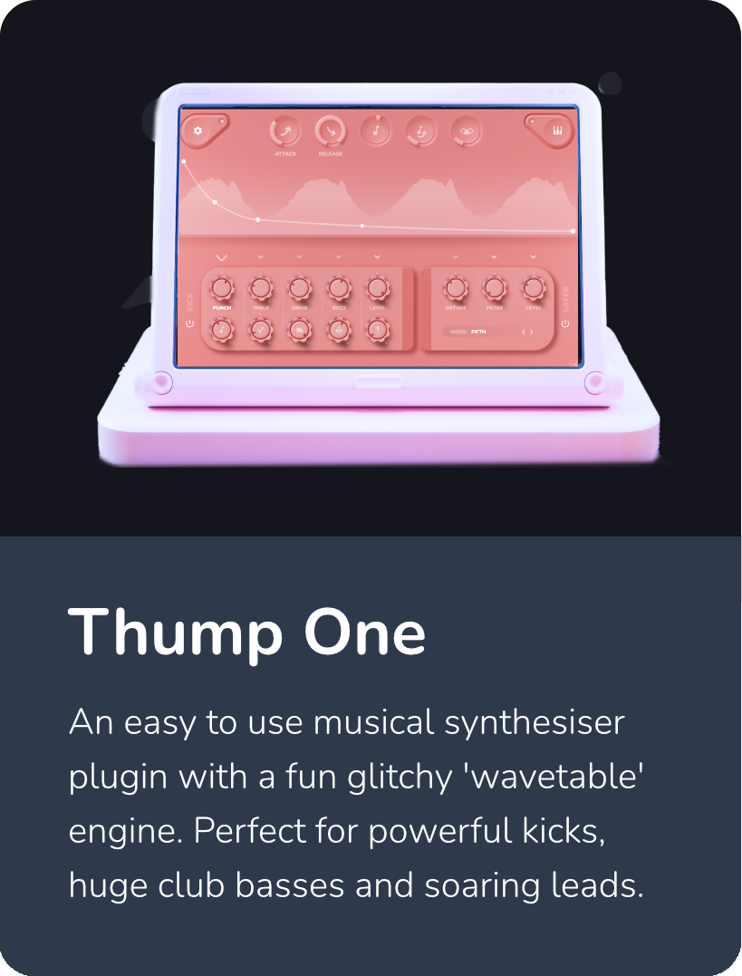 Thump One is an easy to use musical synthesiser with a fun glitchy 'wavetable' engine and a bank of flexible multi-segment envelopes to shape the sound in any direction you desire. Perfect for powerful kick drums, huge club basses and soaring leads