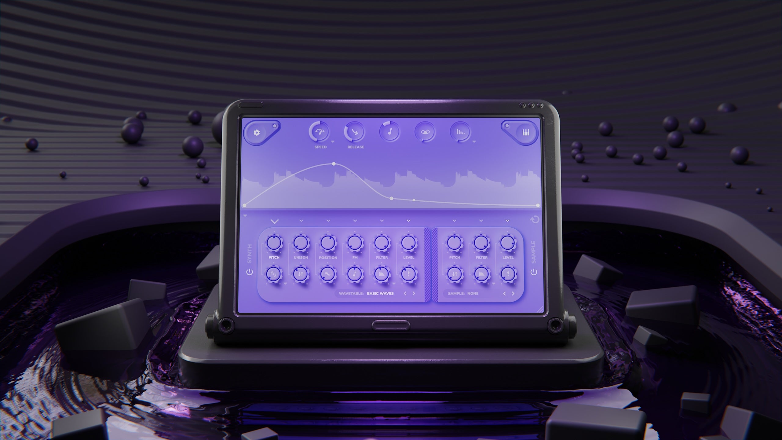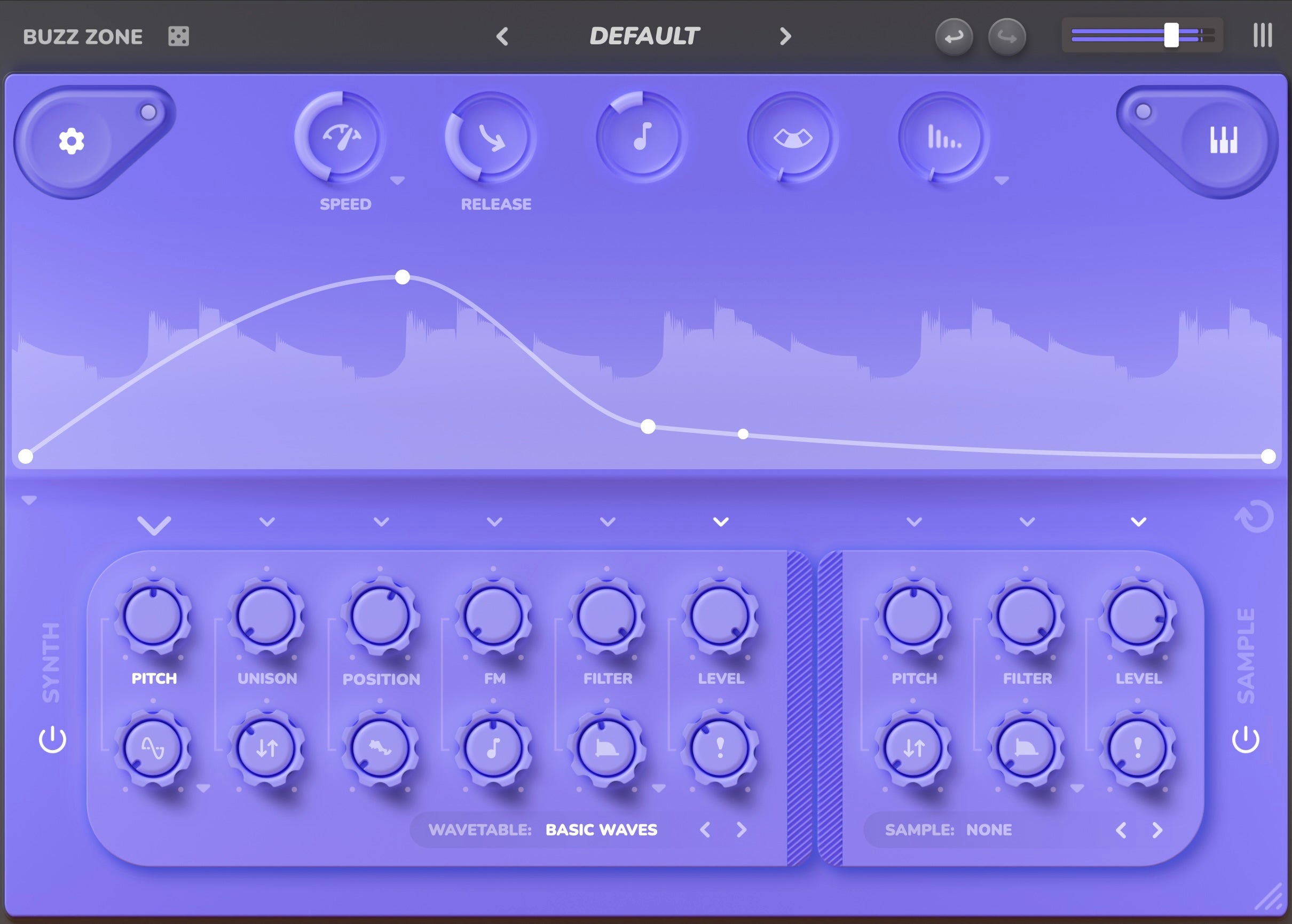 The synthesiser features two powerful engines that can be layered together for a variety of complex sounds and textures. The ‘Synth’ engine features a great sounding 'wavetable' oscillator with a unison function for buzzy, harmonically rich timbres, hence the name! The ‘Sample’ engine can be used to mix additional textures or attacks samples over the sound.